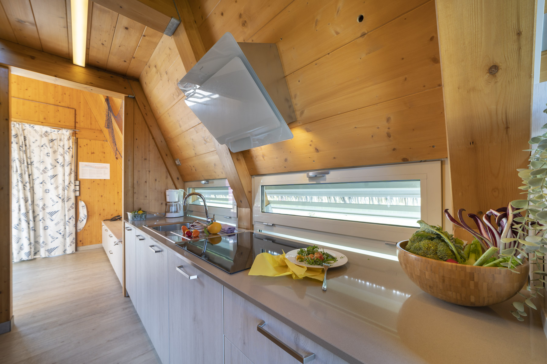 – Living area with dining/living room with kitchenette in glass-ceramics, complete with accessories, dishes and microwave;