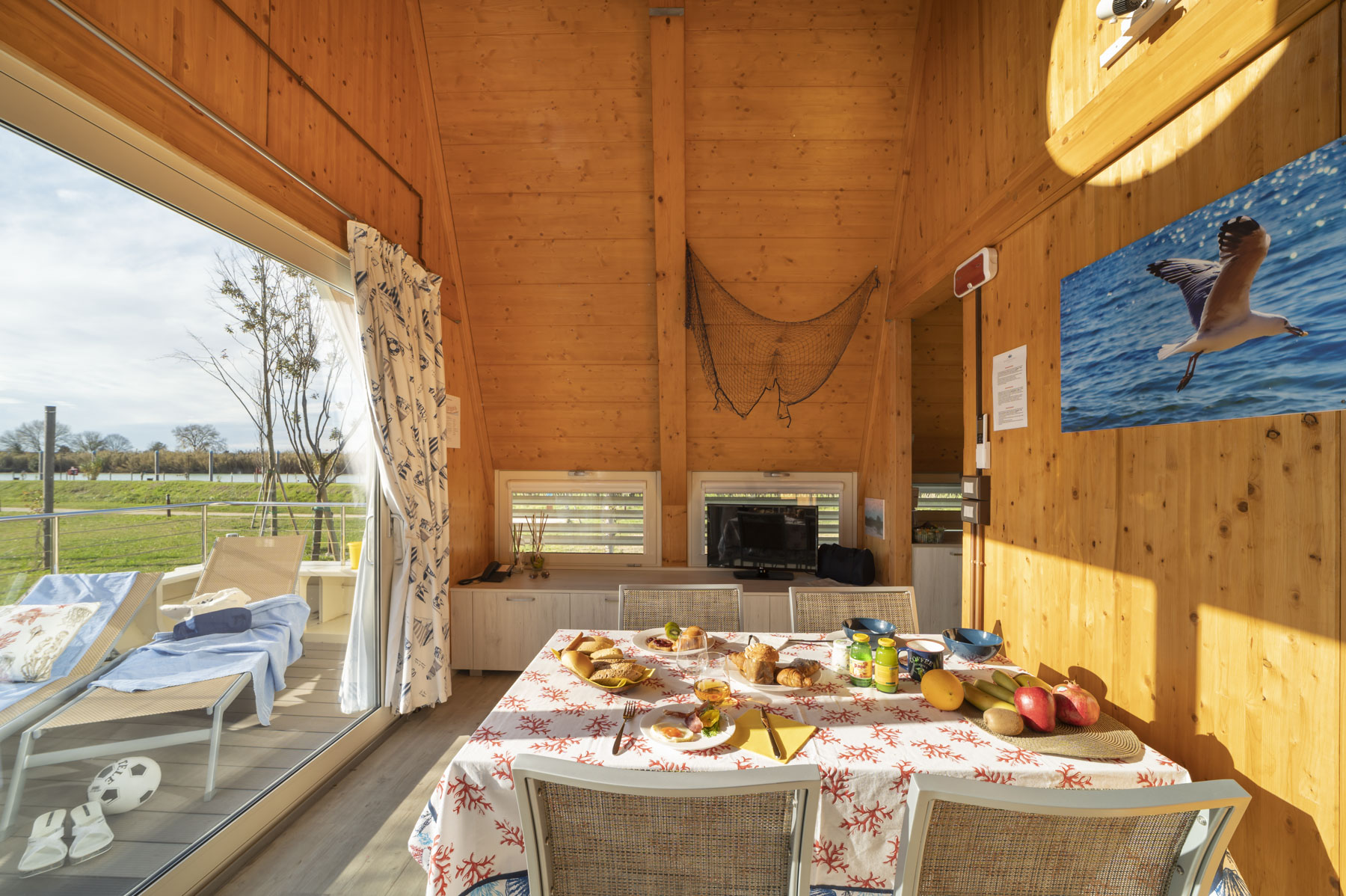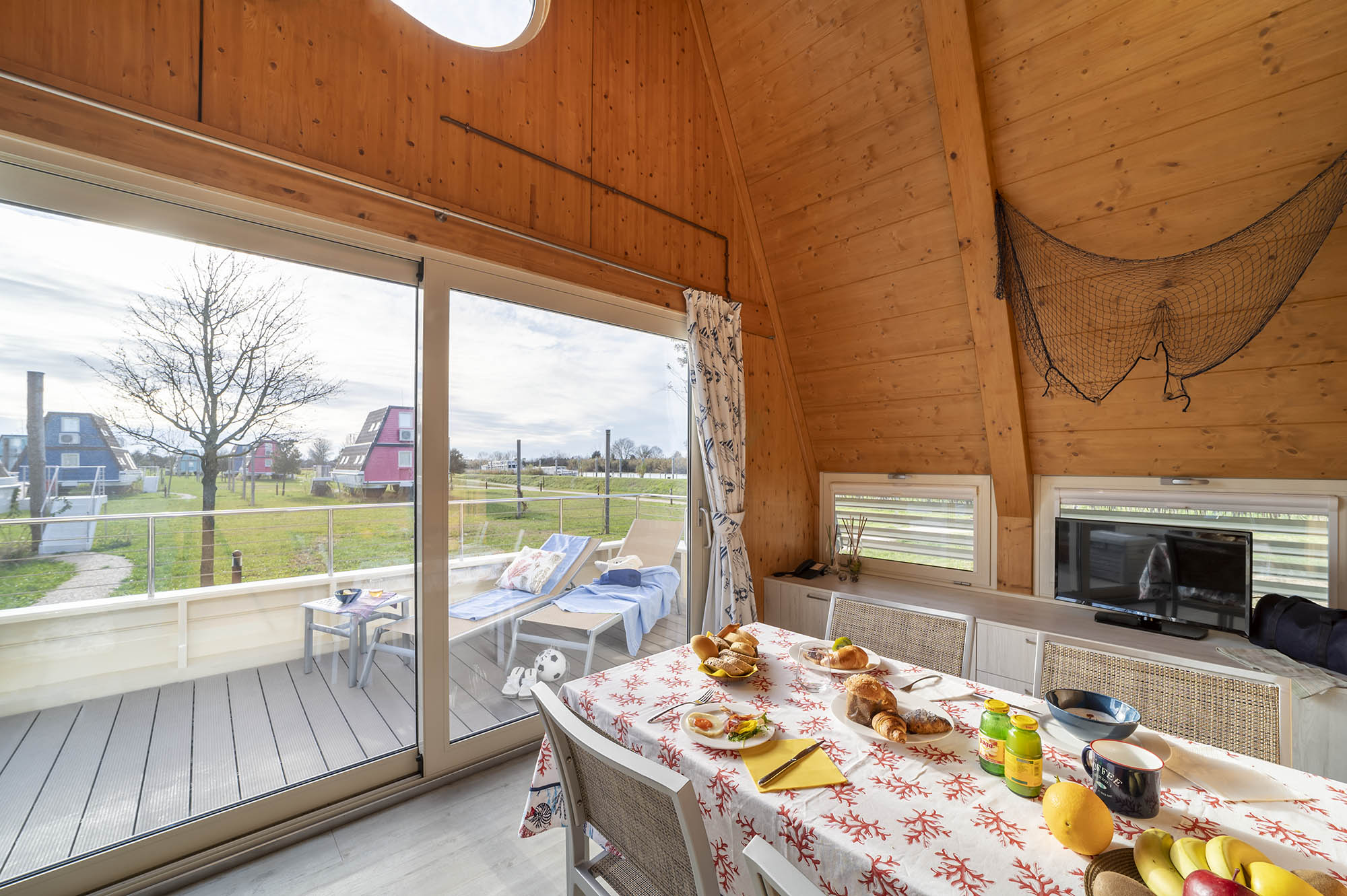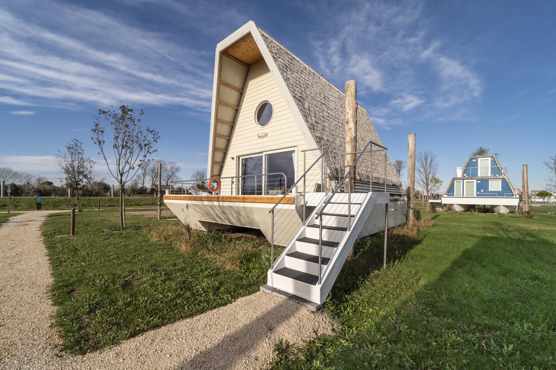 the perfect choice if you want to experience a holiday on a houseboat but at the same time be safely docked on land and pampered with the comforts of a chalet.”